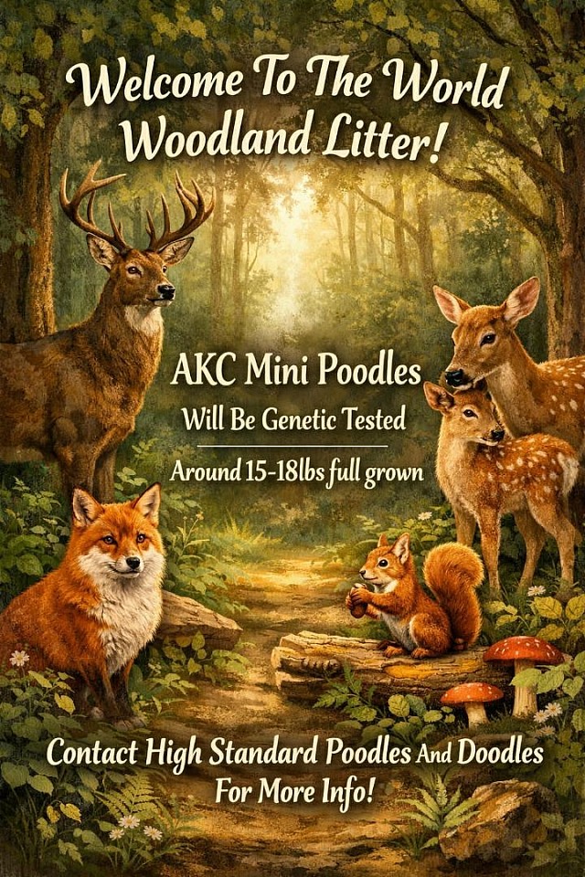 Hello my name is Forest!! I am a beautiful solid Red, AKC Mini Poodle male. My mamma is 15lbs, and my daddy is 17lbs. I will probably be around 15/18lbs when I get all grown up. I will be loved by my family and held and socialized until I come to my new home. I will be UTD on all my vaccines and will come with 1 year of health guarantee along with our High Standard bag full of helpful information and toys. My pet price will be $1,500, but more if you want breeding rights. Contact my wonderful parents if you would like to adopt me. Please hit the Contact us highlight.