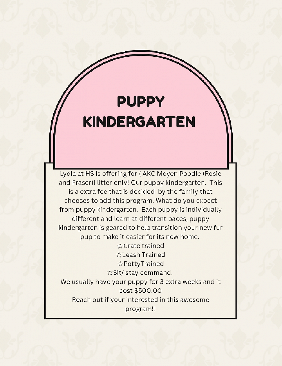 Introducing our AKC Moyen Poodle" Heartland " Litter! We have 6 beautiful Females and 4 Males. Puppies were born.March 24th and will be ready end of May! We currently have 2 deposits on this litter.