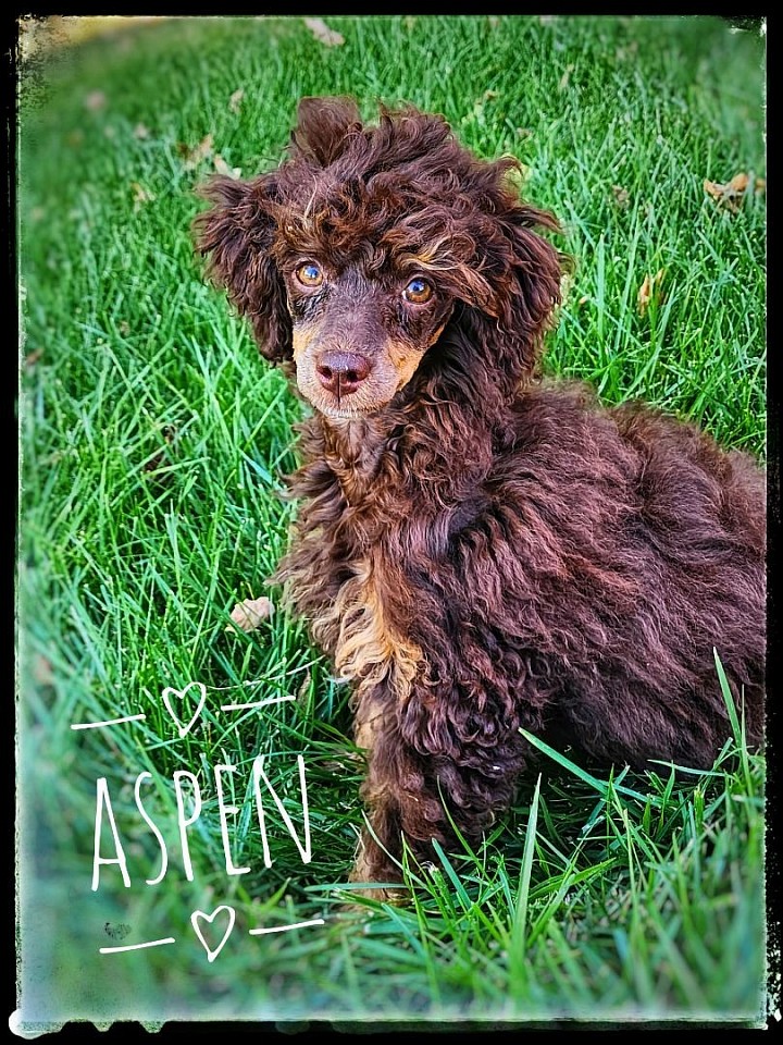 Hello my name is Aspen. I am a beautiful chocolate Phantom, AKC Mini Poodle female. I am totally gentic clear and my colors are kyky atat Ee bb Ss. My mamma is 18lbs, and my daddy is 14lbs. I will probably be around 15/18lbs when I get all grown up. I will be loved by my family and held and socialized until I come to my new home. I will be UTD on all my vaccines and will come with 1 year of health guarantee along with our High Standard bag full of helpful information and toys. My pet price will be $2500, but more if you want breeding rights. Contact my wonderful parents if you would like to adopt me.