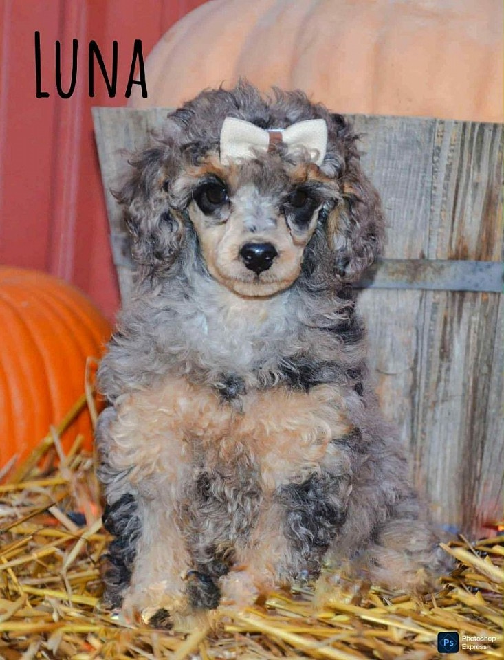 Hello my name is Luna. I am a beautiful Blue Merle Phantom, AKC Mini Poodle female. My mamma is 10lbs, and my daddy is 17lbs. I will probably be around 12/17lbs when I get all grown up. I will be loved by my family and held and socialized until I come to my new home. I will be UTD on all my vaccines and will come with 1 year of health guarantee along with our High Standard bag full of helpful information and toys. My pet price will be $2,000, but more if you want breeding rights. Contact my wonderful parents if you would like to adopt me.