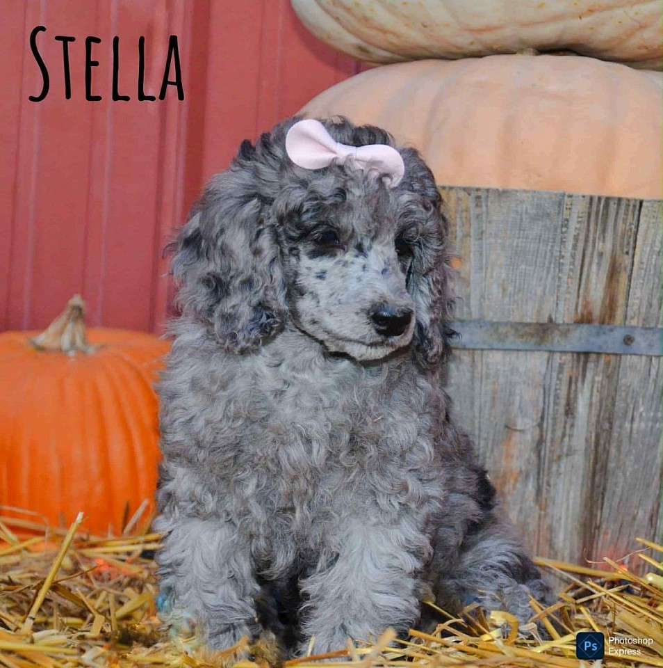 Hello my name is Stella. I am a beautiful Blue Merle AKC Mini Poodle female. My mamma is 10lbs, and my daddy is 17lbs. I will probably be around 12/17lbs when I get all grown up. I will be loved by my family and held and socialized until I come to my new home. I will be UTD on all my vaccines and will come with 1 year of health guarantee along with our High Standard bag full of helpful information and toys. My pet price will be $1800, but more if you want breeding rights. Contact my wonderful parents if you would like to adopt me.