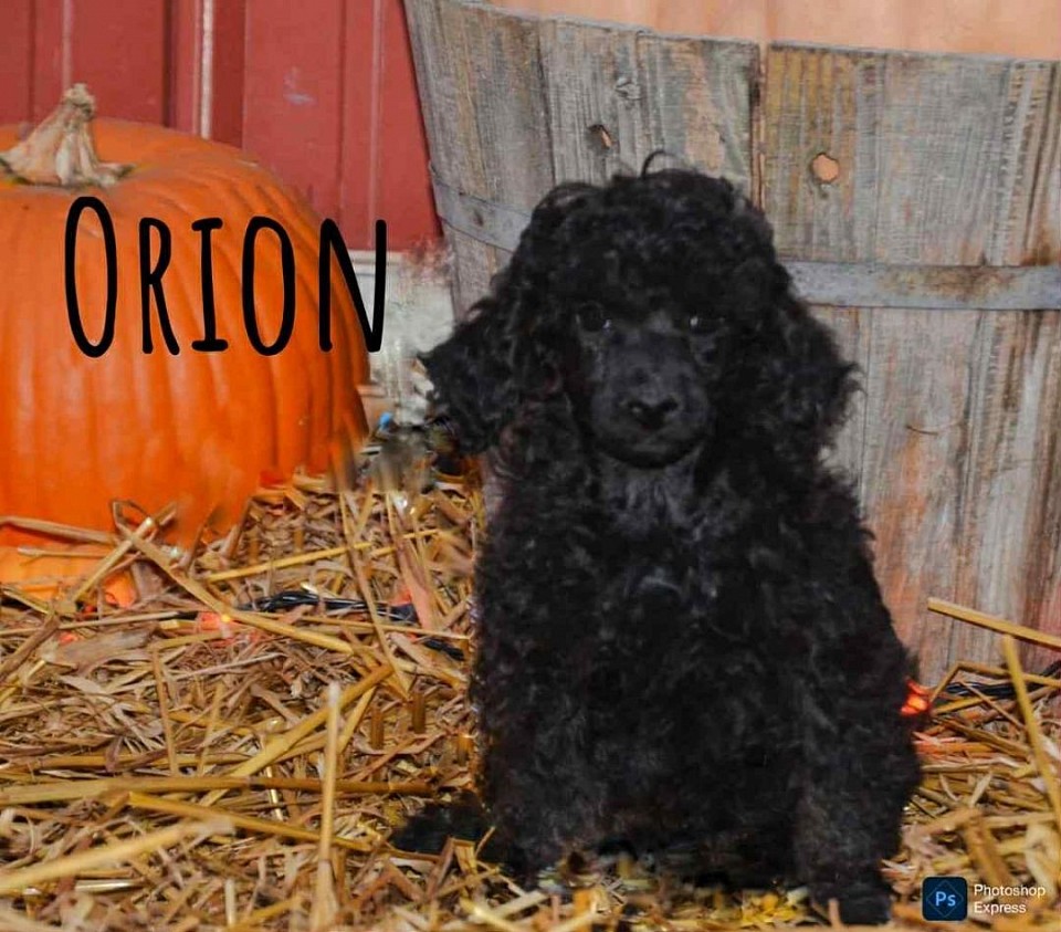 Hello my name is Orion. I am a beautiful Black AKC Mini Poodle female. My mamma is 10lbs, and my daddy is 17lbs. I will probably be around 12/17lbs when I get all grown up. I will be loved by my family and held and socialized until I come to my new home. I will be UTD on all my vaccines and will come with 1 year of health guarantee along with our High Standard bag full of helpful information and toys. My pet price will be $1400, but more if you want breeding rights. Contact my wonderful parents if you would like to adopt me.