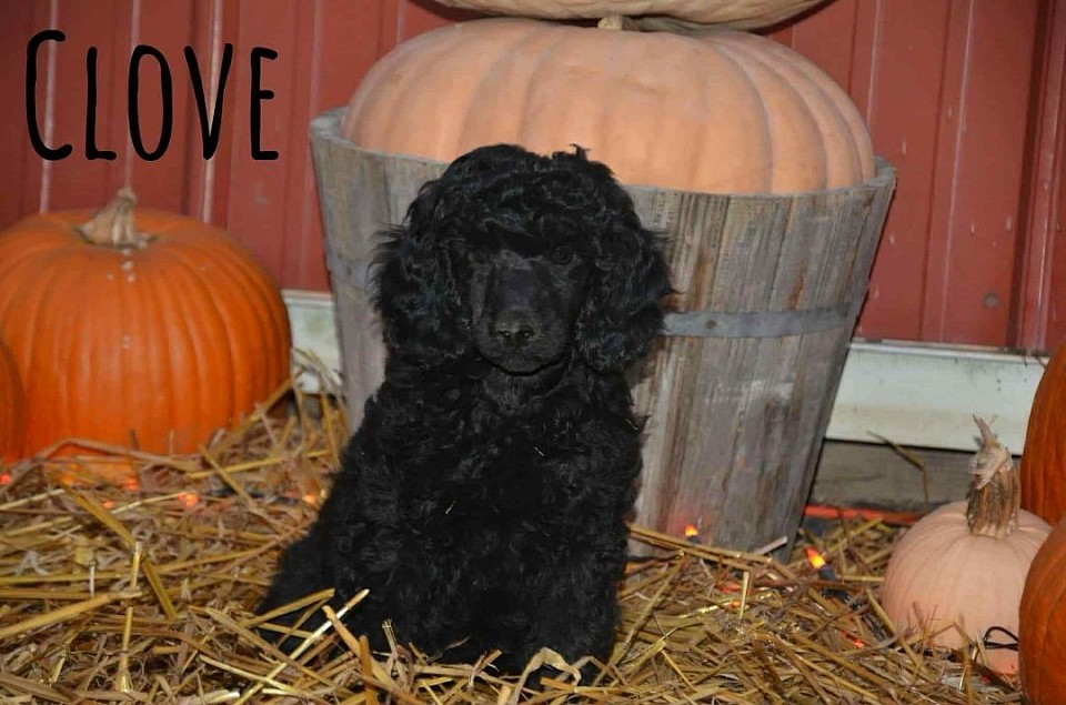 Hello my name is Clove. I am a beautiful black AKC Mini Poodle female. My mamma is 17lbs, and my daddy is 17lbs. I will probably be around 17lbs when I get all grown up. I will be loved by my family and held and socialized until I come to my new home. I will be UTD on all my vaccines and will come with 1 year of health guarantee along with our High Standard bag full of helpful information and toys. My pet price will be $1500, but more if you want breeding rights. Contact my wonderful parents if you would like to adopt me.