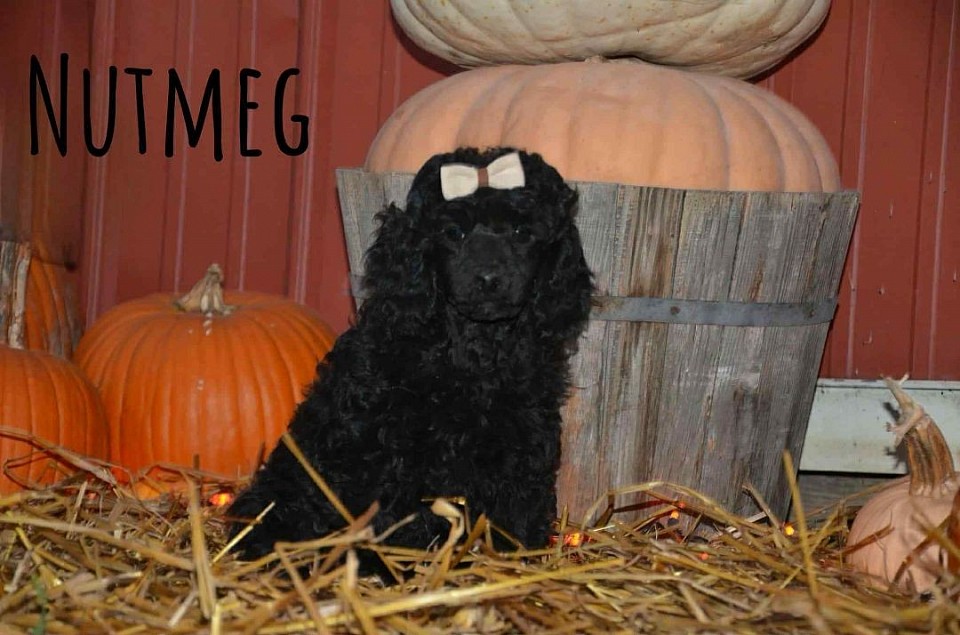 Hello my name is Nutmeg. I am a beautiful Black AKC Mini Poodle female. My mamma is 17lbs, and my daddy is 17lbs. I will probably be around 17lbs when I get all grown up. I will be loved by my family and held and socialized until I come to my new home. I will be UTD on all my vaccines and will come with 1 year of health guarantee along with our High Standard bag full of helpful information and toys. My pet price will be $1500, but more if you want breeding rights. Contact my wonderful parents if you would like to adopt me.