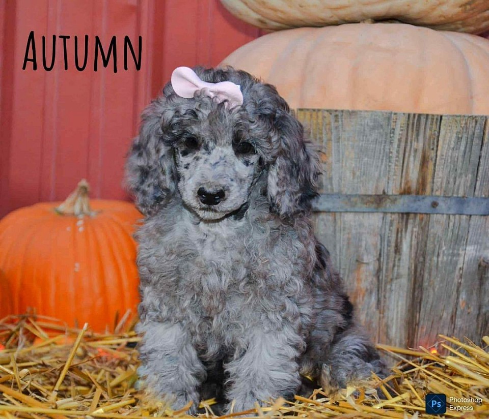 Hello my name is Autumn. I am a beautiful AKC Blue Merle Mini Poodle female. My mamma is 17lbs, and my daddy is 17lbs. I will probably be around 17lbs when I get all grown up. I will be loved by my family and held and socialized until I come to my new home. I will be UTD on all my vaccines and will come with 1 year of health guarantee along with our High Standard bag full of helpful information and toys. My pet price will be $1800, but more if you want breeding rights. Contact my wonderful parents if you would like to adopt me.
