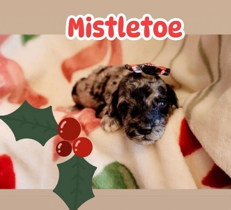 Hello my name is Mistletoe, and I will be ready for Christmas!!! I am a beautiful blue Merle, AKC Small Standard (Moyen) Poodle female. My mamma is 40lbs, and my daddy is 17lbs. I will probably be around 24/35lbs when I get all grown up. I will be loved by my family and held and socialized until I come to my new home. I will be UTD on all my vaccines and will come with 1 year of health guarantee along with our High Standard bag full of helpful information and toys. My pet price will be $2,000, but more if you want breeding rights. Contact my wonderful parents if you would like to adopt me.